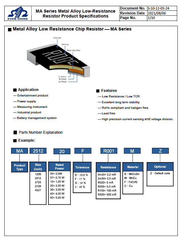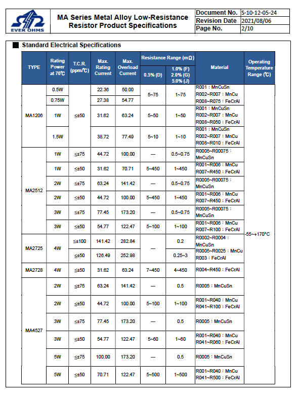 天二合金电阻 MA系列金属合金低阻电阻产品规格