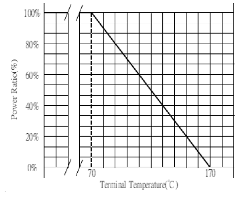 产品特性 低电阻/TCR 优异的长期稳定性 符合 RoHs 且不含卤素。 无铅。 高精度电流感应和分压。 优秀的抗浪涌能力。 符合 AEC-Q200 性能特点 功率降额曲线 工作温度范围:-65°C ~+170°C。 终端温度高于 70°C,额定功率必须按照以下曲线降额: